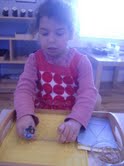 Iyar has come back from winter break interested in the letters of her name. She has been searching for her beginning letter "I". While working with the "felt objects tray" she found the letter I and the Letter S for her big Sister Sitar. Iyar was then working on the rubber band tray and was working on making a capitol "I", she was working so hard and told me "I need something "be-emtza"- in the middle. She got the lines on top and bottom. After working it out she succeeds, look at her face :). (By Morah Estee)