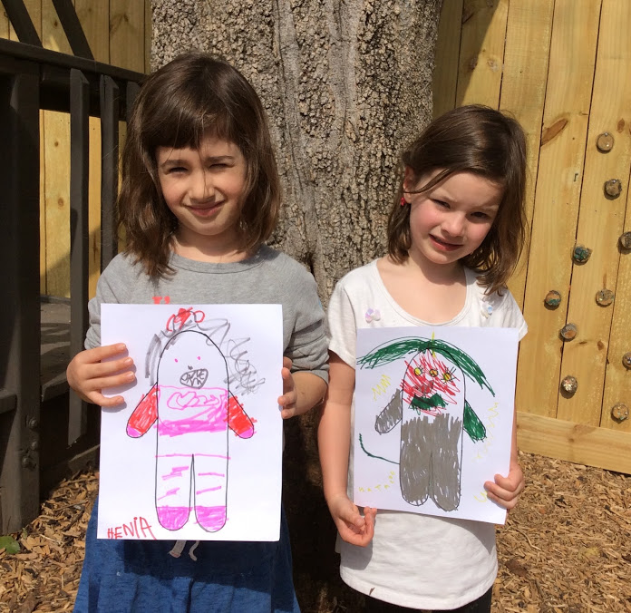 After watching videos of the dolls, it was time for the children to help design a doll. Florence drew the basic doll on a very large chalkboard and asked the children what kind of doll they wanted to create. A koala bear blabla doll complete with a whistle was the result of this cooperative effort.